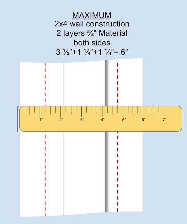2 x 6 wall. A wall is a collection of studs (usually sized 2×4 or 2×6) equally spaced (usually 16 in or 24 in on center) and sandwiched between top and bottom plates The top plate can be either single or double Double plating is most common on loadbearing walls unless the roof rafters or trusses and floor joists stack directly over the studs in the. If the rafter is cut for full bearing on a 2x6 wall, the resulting notch would be deeper than 213/16 inches Keep in mind that even if your rafter stock is sized larger than it needs to be for its span, you still shouldn't overnotch This is because larger knots are allowed in 2x10s and 2x12s than in 2x6s and 2x8s;. 0lbs 91kg Max Weight Per Door 60" 1524mm x 108" 2743mm Max Door Size 1" 25mm 3" 76mm Door Thickness 51/2" 140mm (2x6) Min Wall Structure Thickness All Steel Split Studs SelfTapping Drywall and Trim Screws Included;.