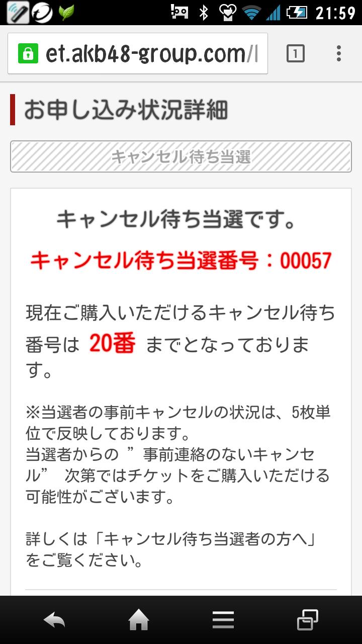 Akb公演のキャンセル待ちの場合は、 チケット販売が終わってから呼び出しがあるようです。 キャンセル待ちには、抽選対象内になるもの、抽選対象外になるものがあります。 その数は、公演によって大きく変わるようです。. と喜んだのも束の間。 キャン待ちでしたw キャン待ち番号は50番を超えている。 以前の2回のキャン待ち当選はいずれも140番代だったので、. AKB48劇場キャンセル待ち 劇場公演チケットは全てチケットセンターへの事前応募による予約制になっており、抽選結果には250人分の 「当選」 と150番までの 「キャンセル待ち当選」 があります。 モバイルファンクラブ・二本柱の会の各枠では1番~50番、一般枠では51番から150番のキャンセル待ち整理番号が発行されています。 これらは応募者のうち当選にハズれ.