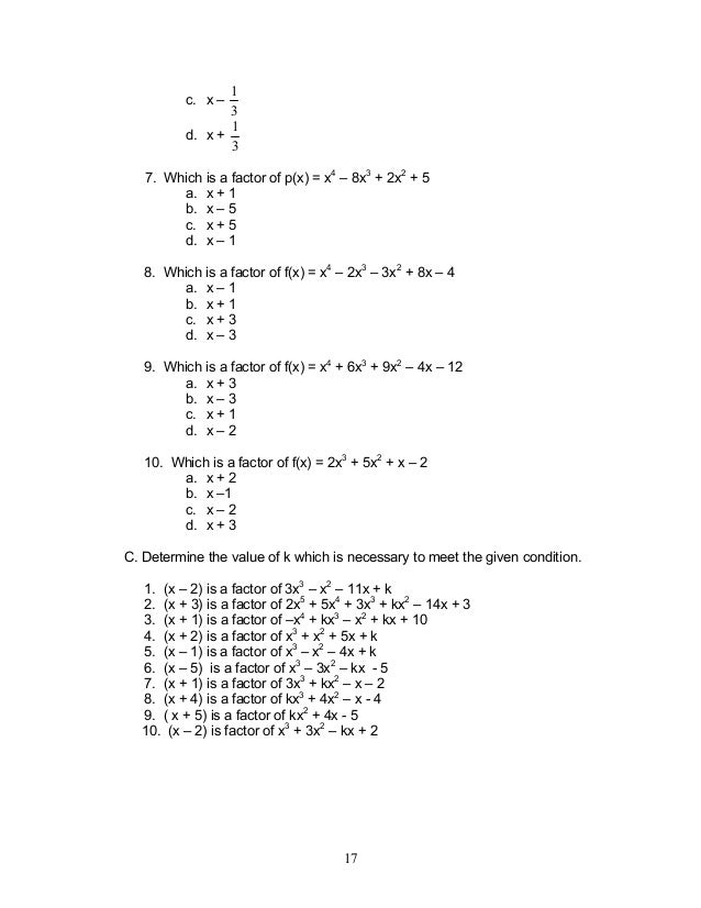 The largest power of x in the original polynomial is 4 So the 1 is multiplied by a power of x which is 1 lower than the degree of the original polynomial One lower than 4 is 3, so we write x 3 after the 1 Then we write x 2 after the first 7 Then x after the second 7 The third 7 on the bottom is the constant term. But, the product of zeroes in any quadratic polynomial equation is given by = constant term / coeffof t 2 = −15/1 = −15 Hence, the relationship is verified (vi) 3x2 – x – 4 3x2 − x − 4 = 3x2 – 4x 3x − 4 = x (3x – 4) 1(3x – 4) = ( x 1) (3x – 4) ∴ zeroes of the given polynomial are – {−1, 4/3 }. Factoring polynomials We have seen above that when we study a polynomial, we need to specify what kind of solutions/factors we are looking for In particular, suppose p (x) is a polynomial with degree greater than 0, and real coefficients, over the comple x numbers p (x) factors into linear factors.