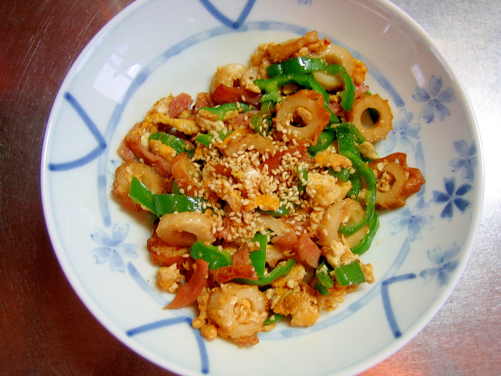 ゴマ風味 ピーマン 竹輪 ベーコンの簡単卵炒め レシピ 作り方 By パンダ大好きねこ 楽天レシピ