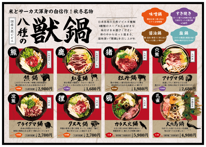 日本一 ジビエ鍋が種類豊富な居酒屋 米とサーカス より 愛されて10年目の秋冬名物 獣鍋 がスタート 熊 鹿 猪 穴熊 アライグマ タヌキ 鴉 クジャクの8種 株式会社 亜細亜tokyoworldのプレスリリース