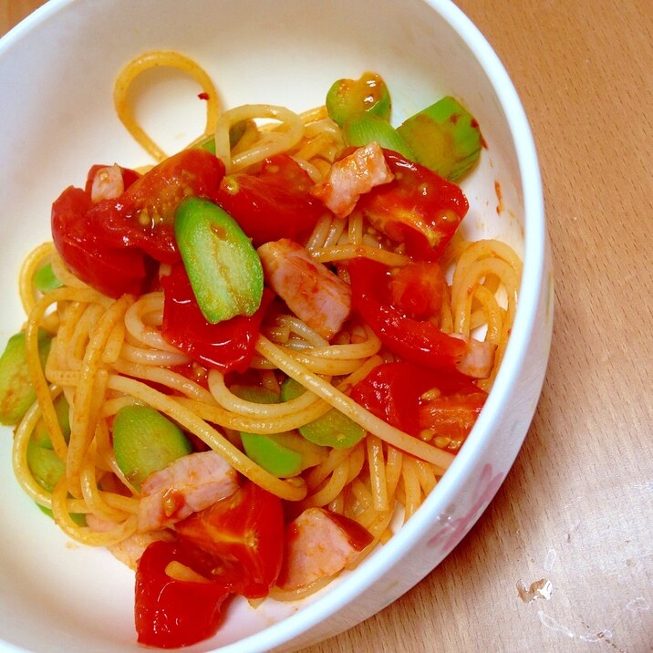 ベーコンとアスパラのトマトスパゲッティのレシピ つくり方 キッコーマン ホームクッキング