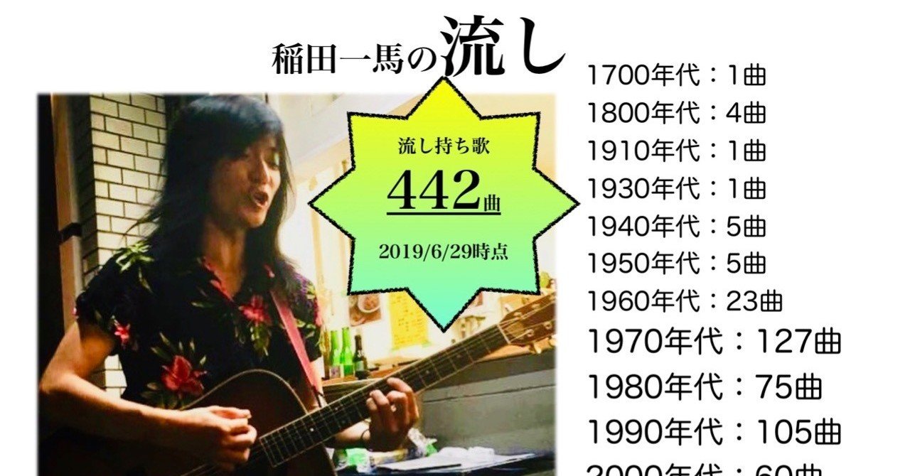 持ち歌442曲 1位は1970年代で127曲 2位は1990年代で105曲 稲田一馬 流し Note