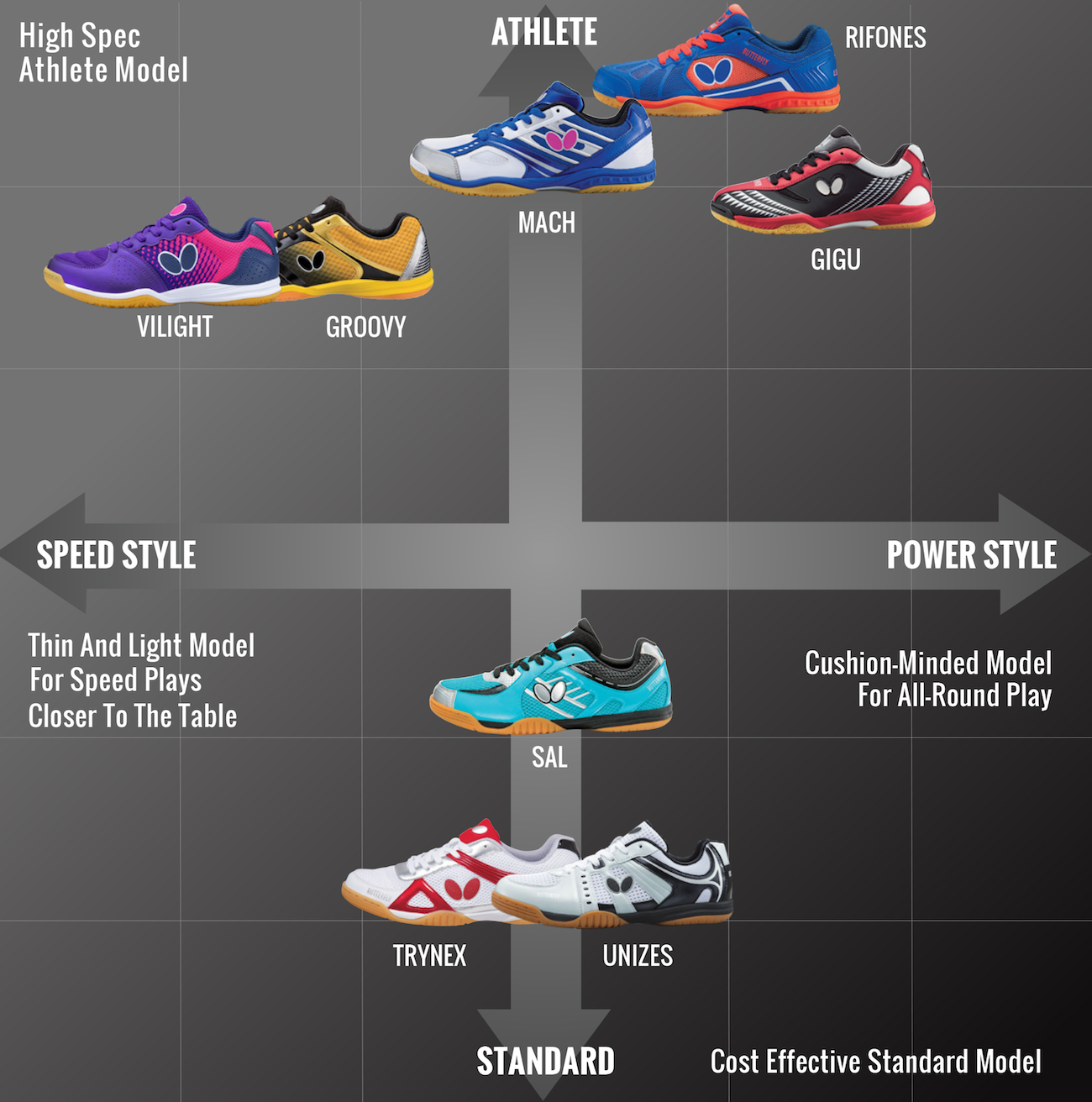 Butterfly table tennis shoes size chart. A thin midsole offers a sense of being ‘barefoot’, yet is surprisingly comfortable. Smart play at variable distance Jun Mizutani chooses the combination of Dignics 80 and the desirable bounce blade Mizutani Jun ZLC As Dignics 80 has an excellent balance between speed and spin, you can easily decide whether to block or counter depending on the speed of the opponent’s ball. An ankle injury is very common in table tennis Choosing the right shoe will reduce the injury risk How to choose good shoes There are many table tennis shoes from different brands Butterfly, DHS, ASICS, DONIC, Stiga, Joola, Mizuno, Adidas, etcHere is my advice when you want to buy your first shoes for table tennisI recommend you to buy cheap, and good quality table tennis shoes.