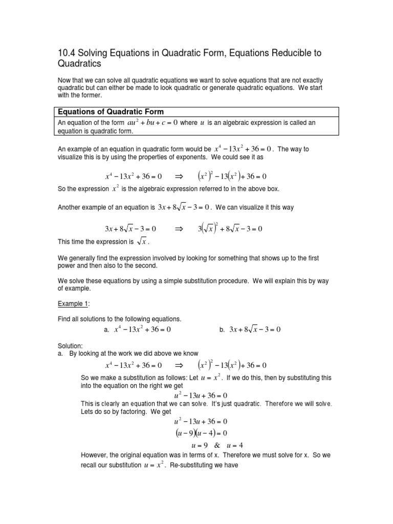 10 4 Solving Equations In Quadratic Form Equations Reducible To Quadratics Quadratic Equation Equations