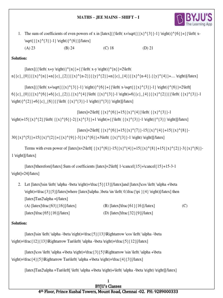 Maths Jee Mains Shift I Byju S Classes 4 Floor Prince Kushal Towers Mount Road Chennai 02 Ph Slope Space