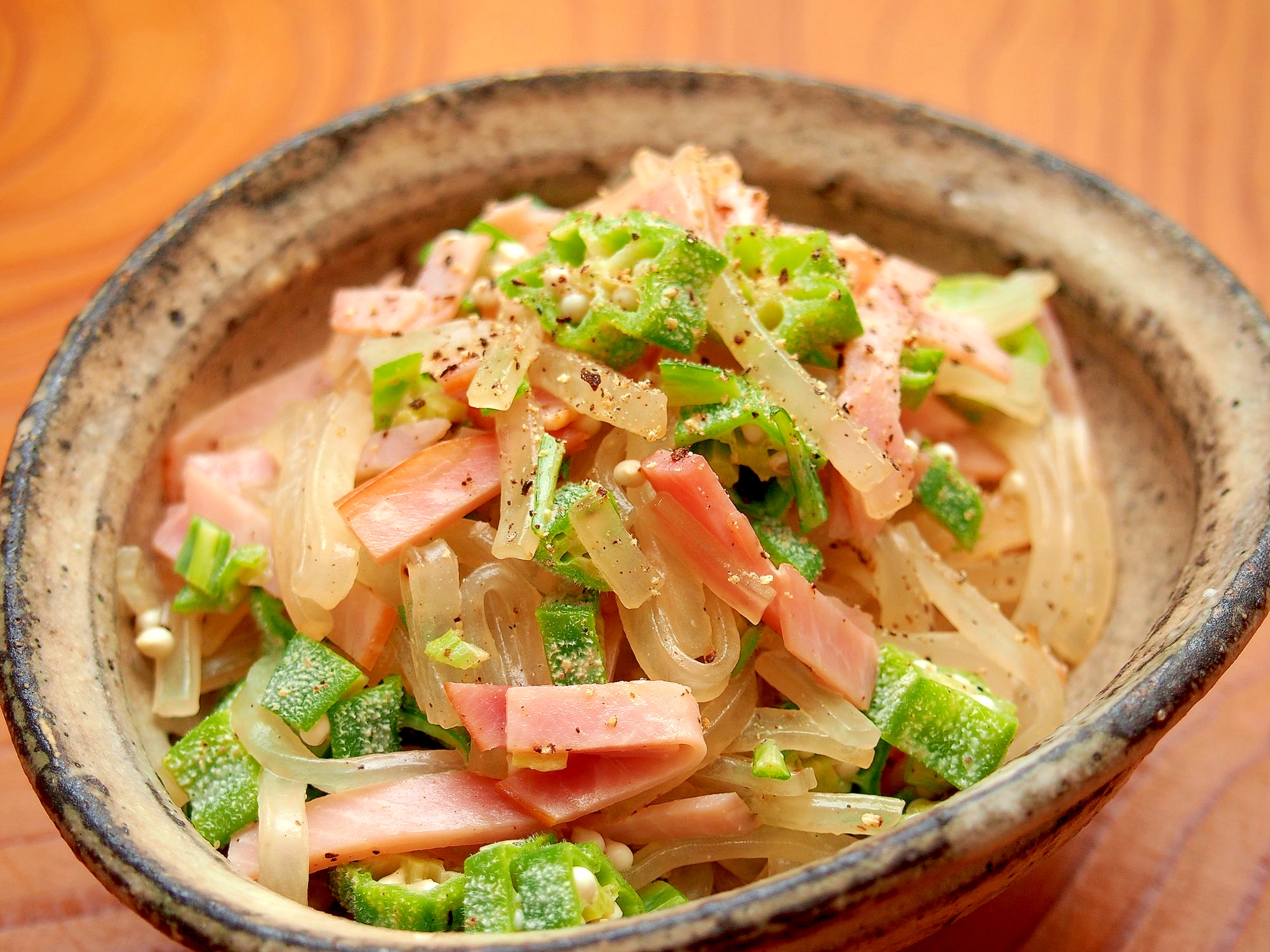 簡単副菜 くずきりとオクラ ハムのポン酢和え レシピ 作り方 By 鶏のから揚げ 楽天レシピ
