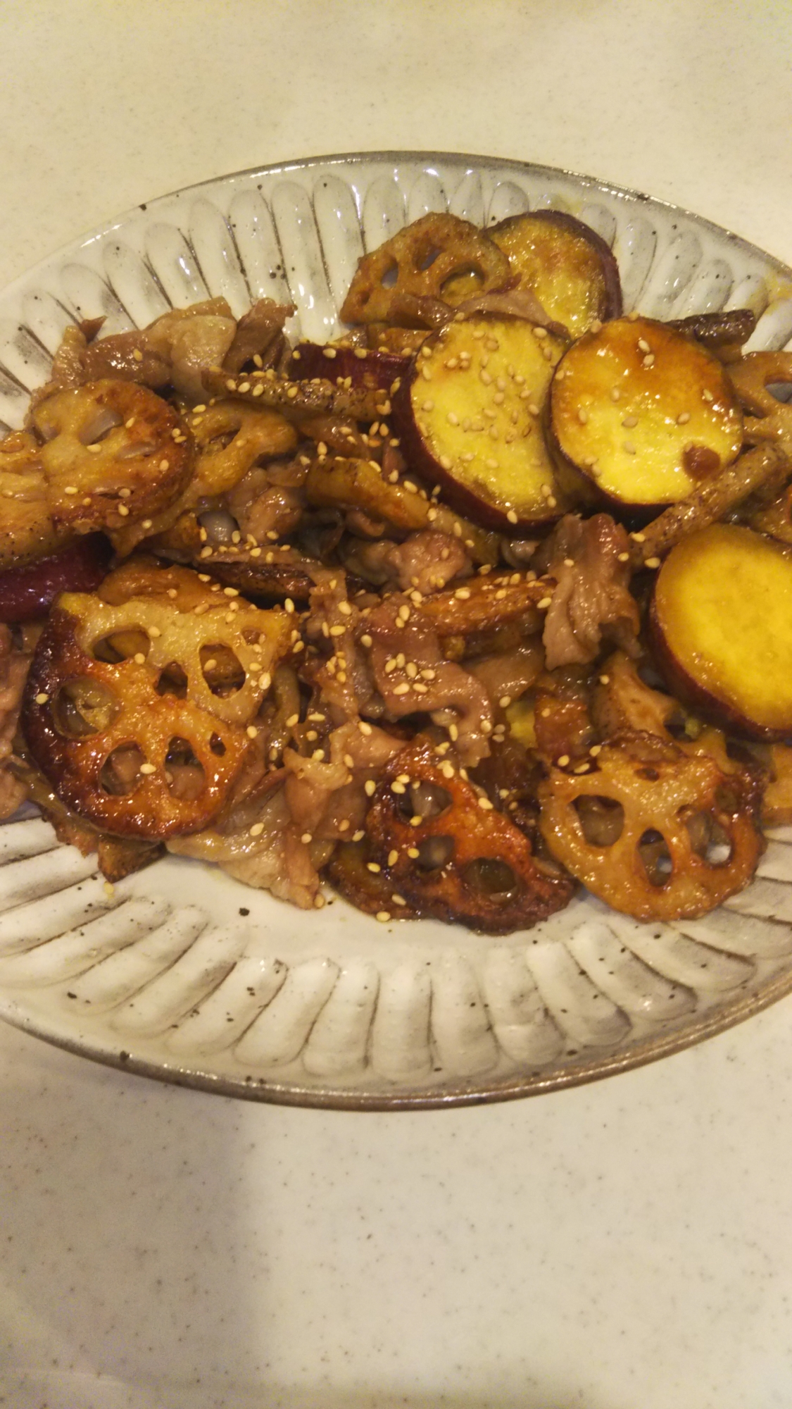 サツマイモとレンコンの豚こま甘辛炒め 暮らしニスタ