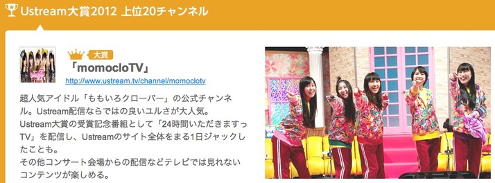 Ustream大賞13 投票開始 ももクロ公式チャンネル Momoclotv は今年もエントリー 2連覇だ Z ご褒美 24時間ust はすでに開催予告 ももクロ侍