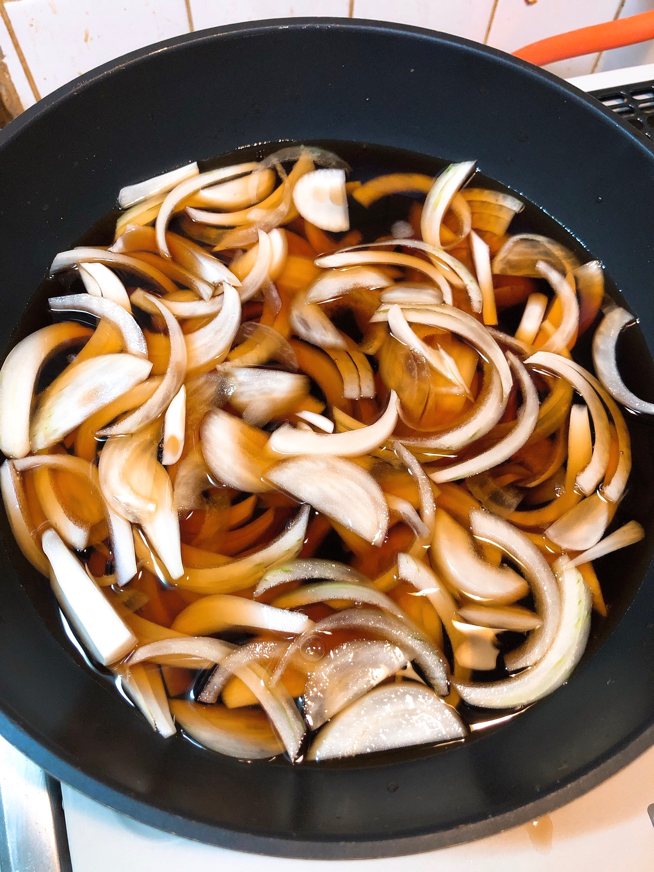 親子丼です オニオンスライスと鶏肉を水と醤油と砂糖と酒とほんだしで煮込んで溶き卵を混ぜたら出来上 きよちゃんのブログ