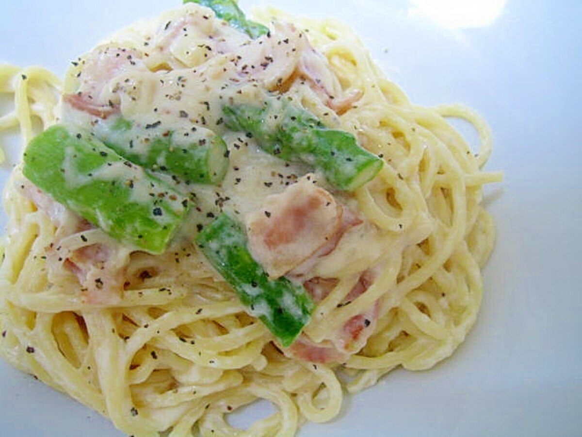 ベーコンとアスパラのクリームスパゲティ レシピ 作り方 By ミルク白うさぎ 楽天レシピ