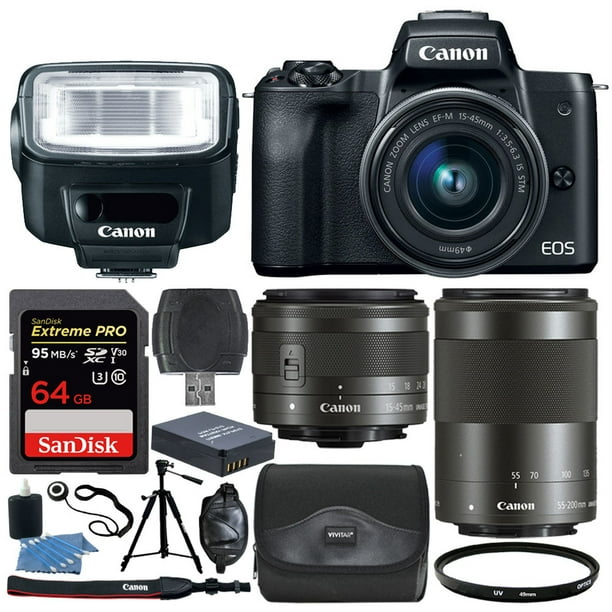 A great standard zoom lens for street, travel and everyday shooting For $100 more than the cost of the Canon EOS M50 Mark II camera body alone, you can get this compact, stylish and versatile lens that is ideal for street, travel and everyday shooting. Buy Canon EOS M50 Mark II Mirrorless Digital Camera with 1545mm and 550mm Lenses (Black) featuring 241MP APSC CMOS Sensor, DIGIC 8 Image Processor, UHD 4K and HD 7p1 Video Recording, Dual Pixel CMOS AF with Eye Detect AF, 236mDot OLED Electronic Viewfinder, 30" 104mDot VariAngle Touchscreen, WiFi and Bluetooth;. The EOS M50 is a compact interchangeable lens camera for aspiring photographers looking for an easy way to boost the quality of their photos and videos With clear, highresolution 4K UHD 24p video, you can capture the incredible details and cinematic moments of your life at home or wherever your adventures take you.
